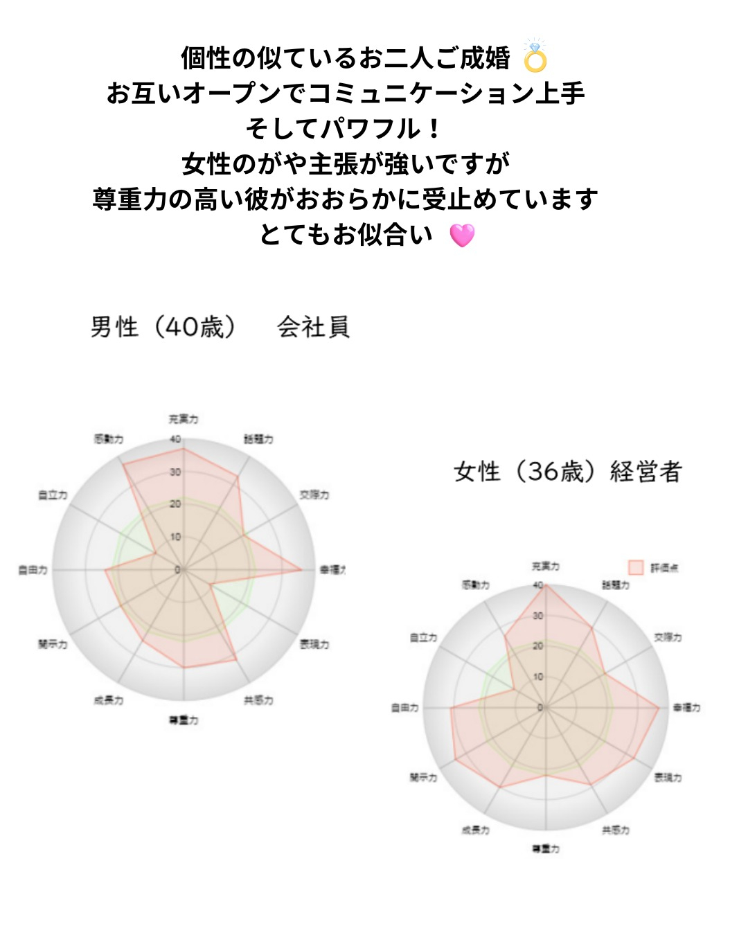 性格が可視化され合理的なアドバイスを頂けてわかりやすかったです。 孤独が苦手で自分でも家族がいた方が満たされる自覚があります。 良い所を沢山教えて頂き、自信を持っていいと言って頂けて嬉しかったです。